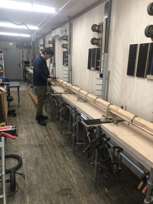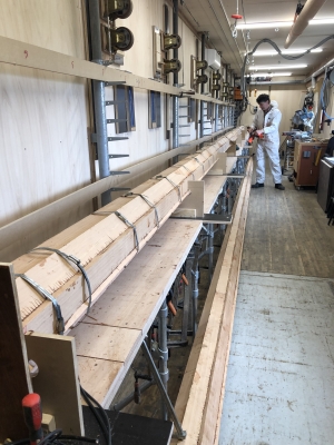 De bank is voorzien van heel veel poten zodat de mast die er op ligt altijd op een stabiele en volkomen vlakke ondergrond ligt. Op een vast punt staat het laserapparaat waarmee de mallen waar de te verlijmen mast in ligt exact in lijn staan. Verder is er veel aandacht besteed aan veilig hijsen en transporteren, de werkstukken wegen, eenmaal gereed, soms wel 300kg. Ook de klimaatregeling is voor elkaar: zowel in de zomer als in de winter kan de temperatuur gehandhaafd worden op 15 graden Celcius, bij een relatieve luchtvochtigheid van 50-60% de beste omstandigheden voor het maken van lijmverbindingen.