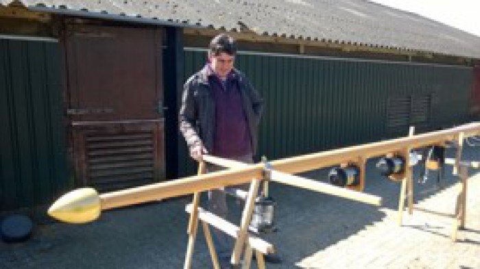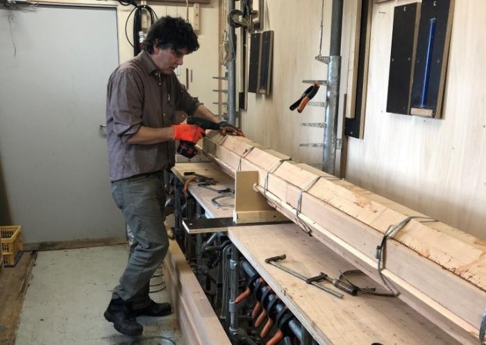 Om grotere (en zwaardere) masten beter kunnen verlijmen hebben we onlangs een nieuwe lijmtafel/afwerkbank in gebruik genomen.