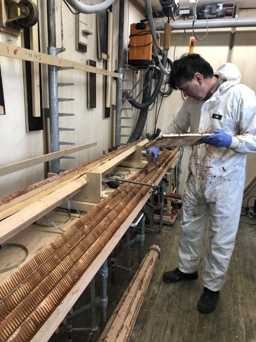 Vanwege de grootte van de rondhouten hebben we de nodige aanpassingen moeten doen, tot dusverre bestond de klantenkring uit eigenaren van zeiljachten, schouwen, botters, draken etc. Met allemaal rondhouten tot ongeveer 12 meter, tilbaar en hanteerbaar. Nu moest er meer hijsmateriaal komen en enkele zwaardere machines.