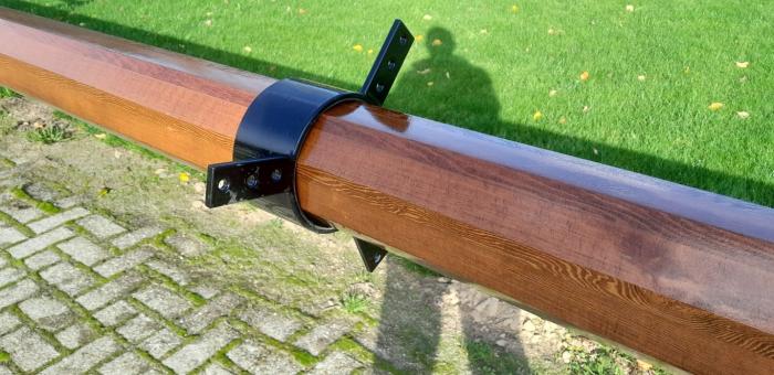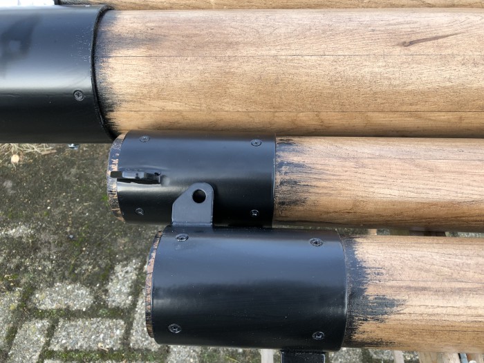 Het beslag voor klassieke rondhouten bestaat vaak uit een serie ringen, voorzien van haken en ogen: zie foto hiernaast.