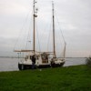 Een opdracht voor nieuwe mast dus. Ditmaal voorzien van allerlei anti-inwater maatregelen, zoals ingelijmde buisjes op de plekken waar de bevestiging door de mast heen gaat. En epoxy-impregneer op het kopse hout zoals de onderkant van de mast, waar vaak waterdruppels aan hangen die anders maar al te gemakkelijk hun weg omhoog in het hout vinden. Op de foto is het drooggevallen schip te zien, nu weer voorzien van een sterke en mooie mast. Kijk maar!