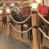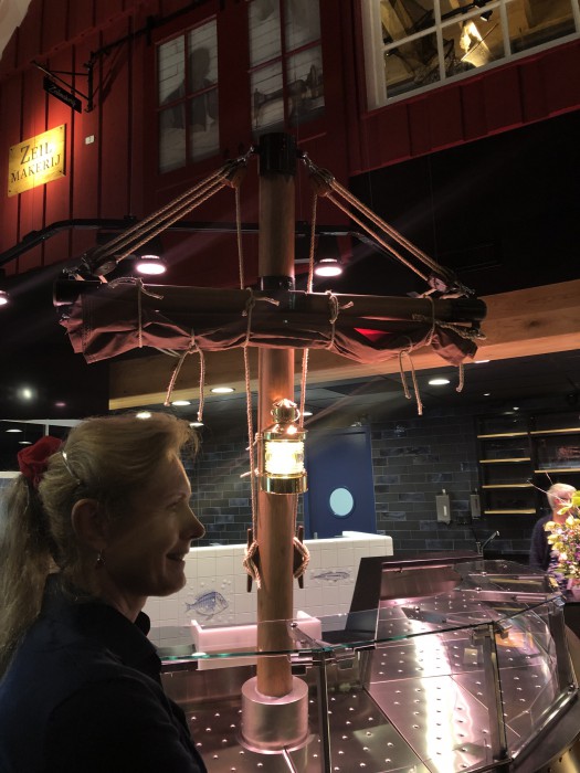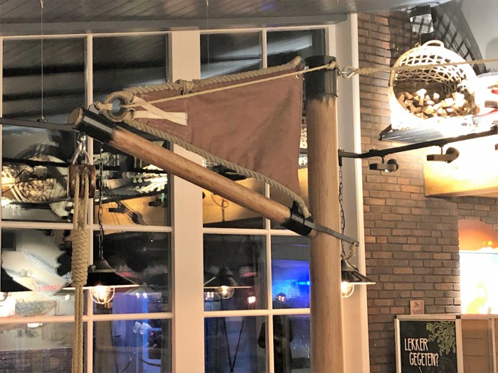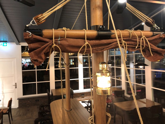 Eens heel iets anders. De eigenaren van een splinternieuw te bouwen visrestaurant wilden hun zaak graag op maritieme wijze gedecoreerd hebben. Ons werd gevraagd om een aantal masten, gaffels en ra’s te maken, compleet met beslag, blokken, vallen en andere lijnen.