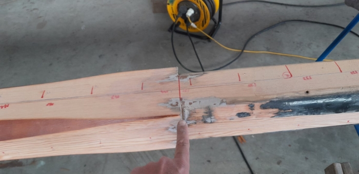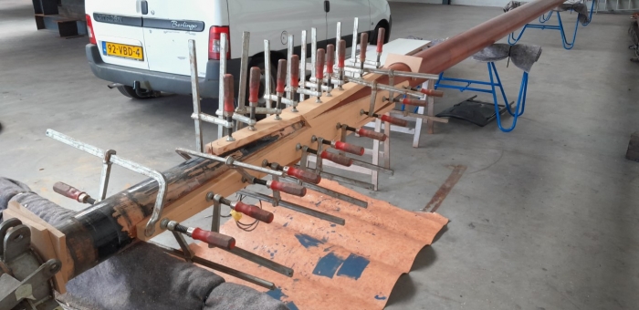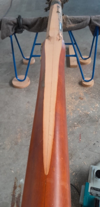 Als je een mast gaat repareren moet je natuurlijk goed kijken naar de toestand van de hele mast. Zijn de lijmnaden nog wel oké, hoe staat het met eventuele windscheuren, is het niet en mooie gelegenheid om de mast kaal te schuren en opnieuw te lakken. En moeten we het verroeste beslag niet even laten stralen en verzinken?