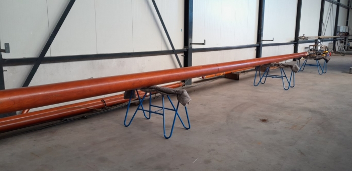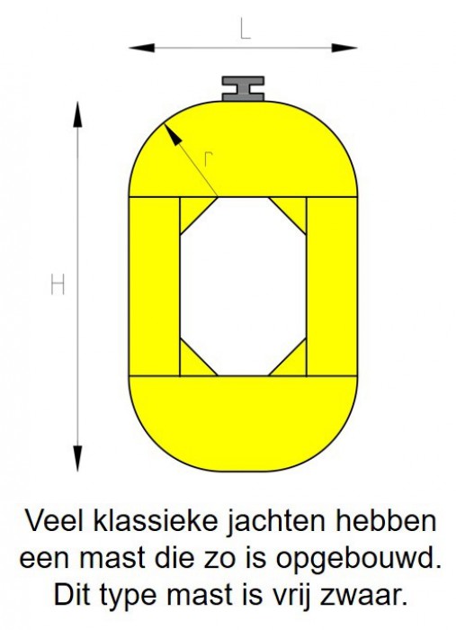 Om bovengenoemde eigenschappen te verkrijgen maken we voor onze ronde masten gebruik van de constructie die hieronder staat afgebeeld. De mast is hierdoor niet massief maar hol wat gewichtsbesparing betekent. En een veel kleinere kans op verticaal scheuren, wat je bij massieve masten vaak ziet.